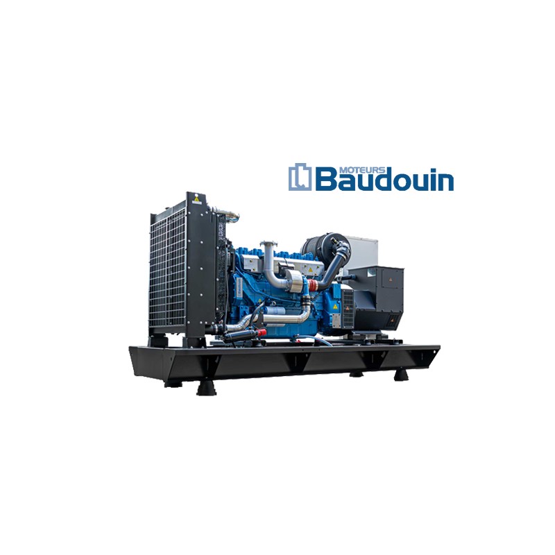Grupul electrogen este echipat cu un motor diesel performant, modern si fiabil produs de renumita companie franceza Baudouin. Acest motor este echipat cu turbocompresor iar turatia se regleaza automat in functie de sarcina cu ajutorul unui regulator de turatie. Racirea se face cu lichid iar ventilatorul radiatorului este mecanic. Temperatura motorului si presiunea uleiului sunt permanent monitorizate prin senzori dedicati. Partile in miscare sau fierbinti sunt protejate cu grilaj. Pornirea se realizeaza cu starter electric iar bateria este incarcata in timpul functionarii de catre alternatorul motorului iar in timpul stationarii de catre un redresor (la modelele cu AAR/ATS). Evacuarea gazelor arse se realizeaza prin toba de esapament de tip industrial care are rol de reducere a zgomotului. Motorul este conceput in concordanta cu cele mai noi directive europene si internationale in ceea ce priveste emisia de noxe pentru categoria de motoare de uz industrial.